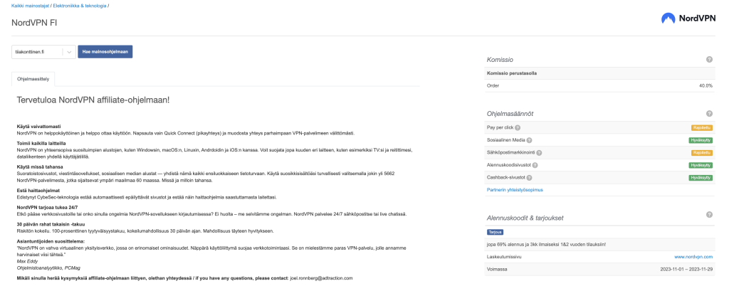 Tässä esimerkissä hain NordVPN ohjelmaan, joka sopii enemmän omaan aiheeseeni. Sen jälkeen kun olet hakenut valittuun ohjelmaan, pääset näkemään mitkä ovat sallittuja ja kiellettyjä asioita markkinoinnissa. Saat myös lyhyen infon tuotteesta, jota voit hyödyntää pohjana kun kirjoitat ja tuotat sisältöä tuotteesta. Tämä sivu on tärkeää lukea läpi rauhassa.