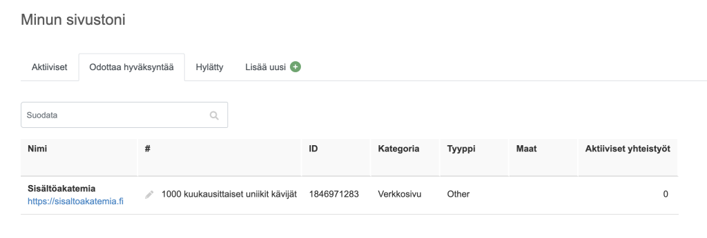 Sivuston lisäämisen jälkeen se jää ”Odottaa hyväksyntää” välilehdelle. Tallennuksen yhteydessä sain virheilmoituksen ™-merkistä, jonka kävin poistamassa.