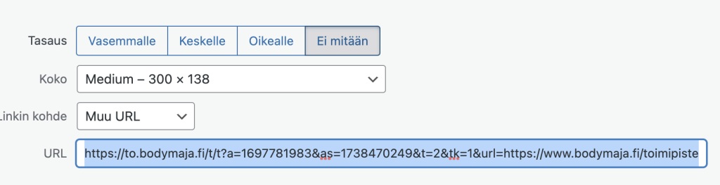 ja lisään sen sille varattuun kohtaan. Alla olevassa kuvassa se on lisätty ensimmäiselle riville. Täppä on kohdassa URL, koska kyseessä on linkki, jonka haluan lisätä postaukseen. Huomaat, että ”Seurantalinkkisi” kohtaan on lisätty kyseinen url, jonka kävin hakemassa. Kun nyt kopioin seurantalinkin ja lisään sen uuteen välilehteen ja klikkaan enter, linkki vie minut suoraan Bodymajan Kuopion toimipisteen sivulle.