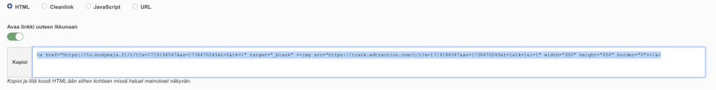 Anna olla täppä kohdassa ”HTML”. Aktivoi ”Avaa linkki uuteen välilehteen” ja sen jälkeen vain kopioi koodi. Huomioi, että kyseessä on siis koodi, ei linkki, joten koodin lisääminen blogiin tapahtuu nyt eri tavalla.