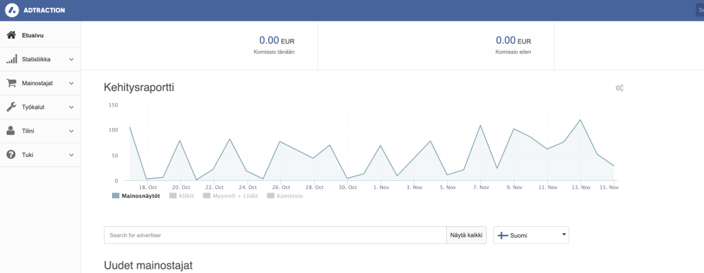 Ohjausnäkymä näyttää tältä. Itselläni ei ole Adtractionin kautta kovinkaan montaa euroa komissioita, sillä oma aiheeni on sen verran erilainen, ettei siihen liittyviä affiliate-ohjelmia tahdo löytyä.
