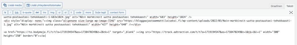 Ja kun menen esikatseluun, banneri näkyy siinä oikealla tavalla. Tämän jälkeen voin tallentaa postauksen, kirjoittaa sen loppuun ja lisätä bannerin koodin vaikka 2 kertaa postaukseen. Riippuen toki kuinka pitkä postausta on. Henkilökohtaisesti suosittelen yhtä banneria jokaista 1000 sanaa kohtaan.