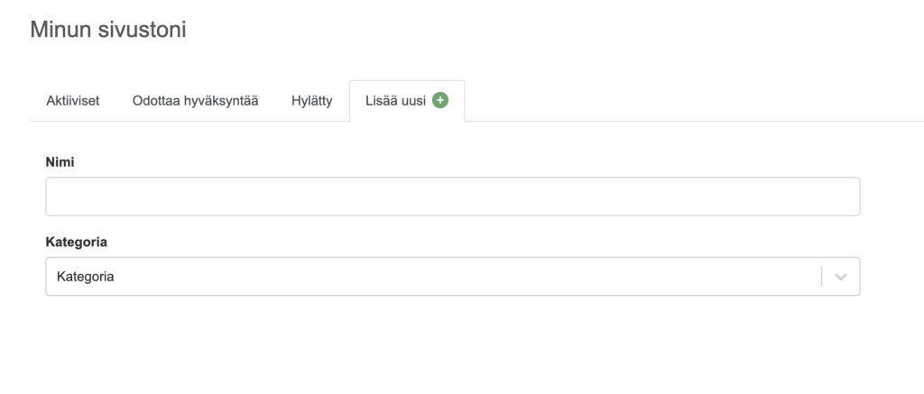 Mene ”Lisää uusi” välilehdelle. Kirjoita sivuston nimi ja valitse sopivin kategoria.