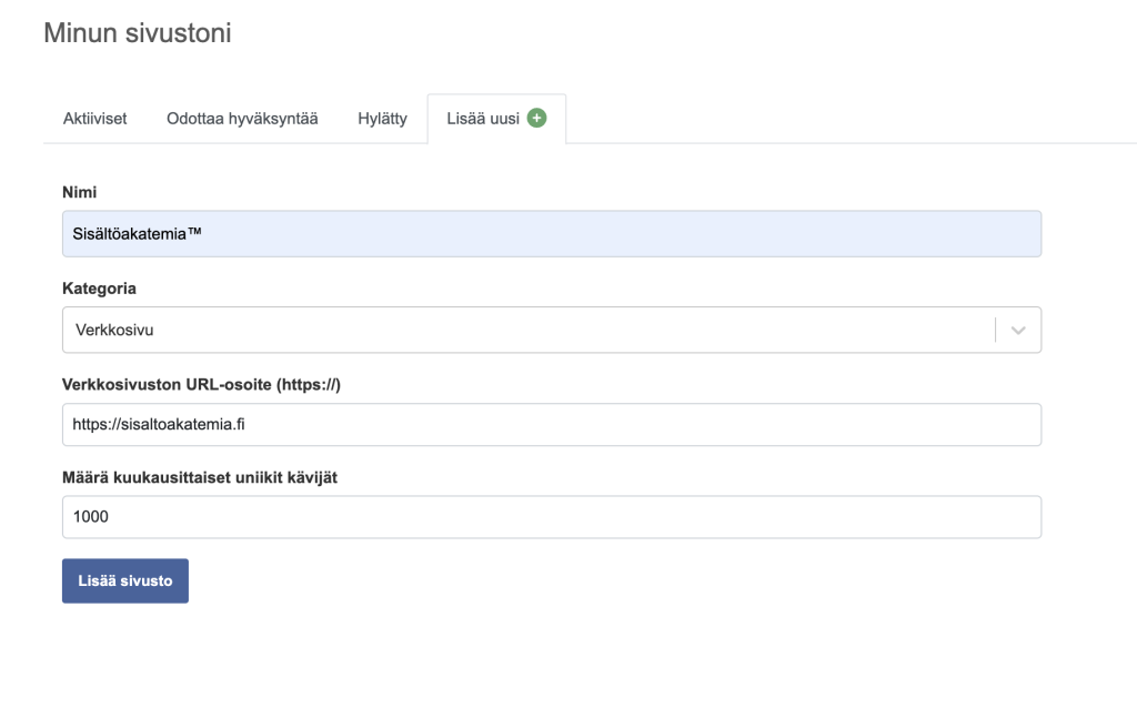 Kun olet lisännyt tarvittavat tiedot, klikkaa ”lisää sivusto” painiketta.